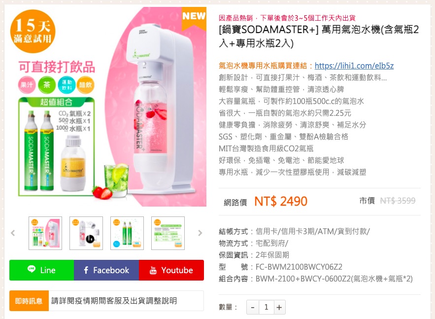 鍋寶的氣泡水機就是官網價格 NT$2,490,但有很多部落客、團媽價都是 NT$1,990。如果想買建議可以逛完官網後忍個 1-2 天,就會被臉書廣告鎖定,然後你就可以買到 NT1,990 價格了,有些是輸入折扣碼、有些是隱藏賣場,總之忍個幾天被廣告投到後,現折 NT$500 很划算吧。